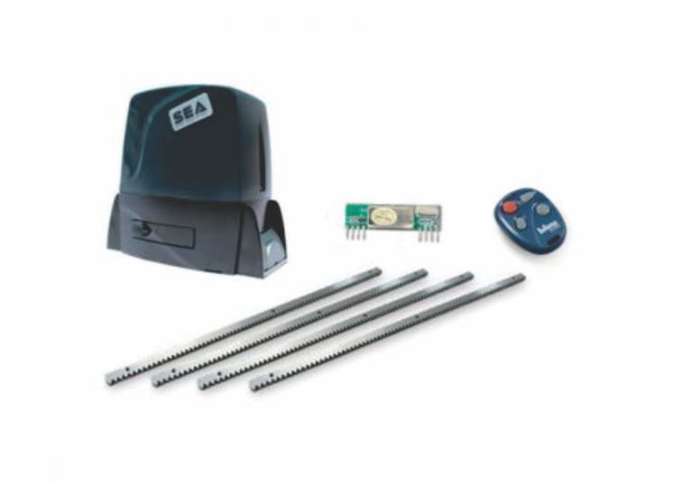 KIT de operador electromecánico SEA SATURN 1000 a 110V / 220V para puertas de hasta 10.0 m, 1000 Kg y 25 ciclos/hora, tarjeta electrónica SEA Gate 1 DG con display y función de deceleración en apertura/cierre. Incluye: 1 operador SEA SATURN 1000, receptor, 1 control remoto de 4 canales y 4 m de cremallera galvanizada 30x12 cm²